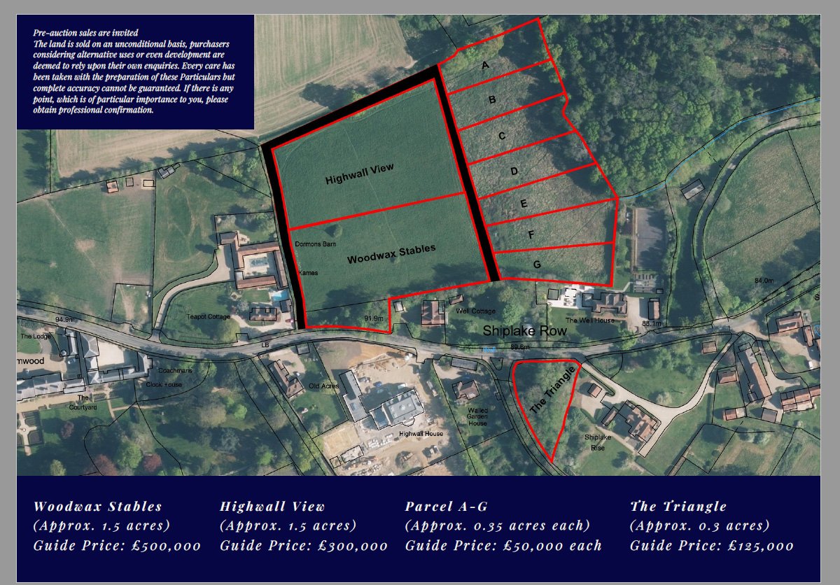 One part of Woodwax Field has planning permission for equestrian purposes and a stable for PERSONAL use only. COMMERCIAL and ANY OTHER DEVELOPMENT is specifically PROHIBITED. A public footpath runs through this plot and the field behind it and the owner will need to maintain and keep it open at all times.
