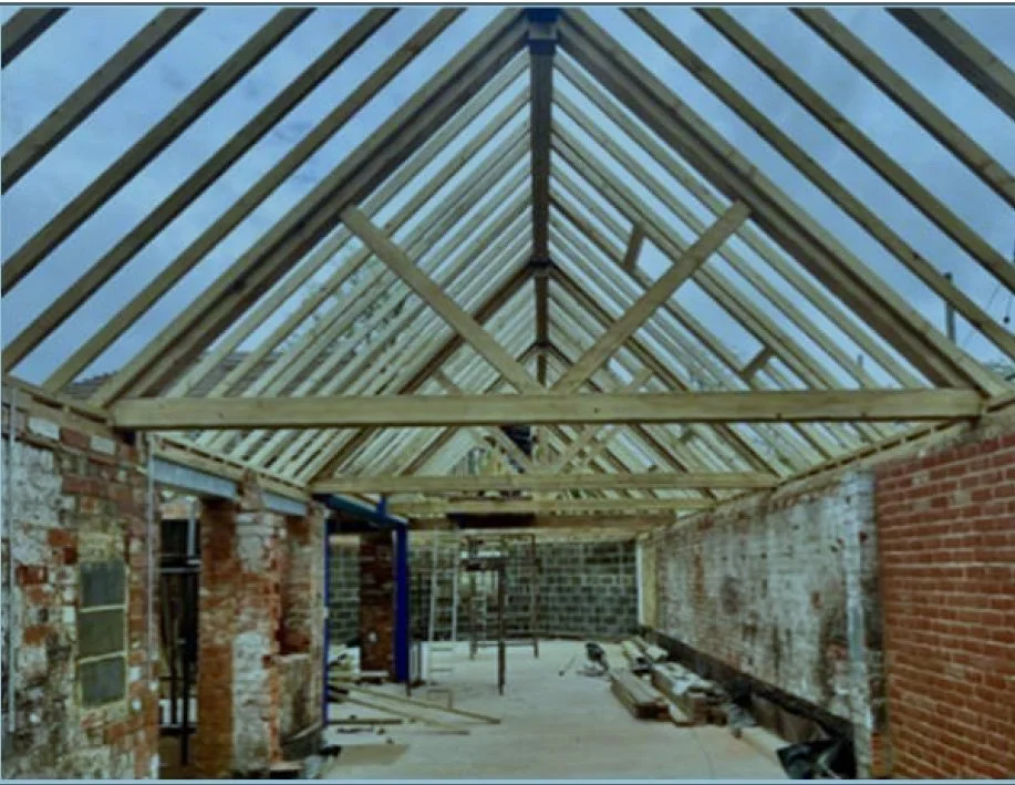 Those passing The Forge may have noticed the rapid addition of roof trusses. The front and rear sections are now joined together by the middle section shown below.
